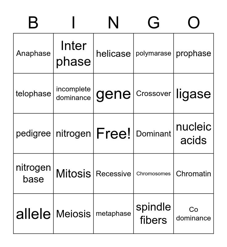 This bingo card has a free space and 24 words: Mitosis, Meiosis, gene, allele, prophase, Anaphase, telophase, Inter phase, Dominant, Recessive, Crossover, pedigree, Chromosomes, Chromatin, incomplete dominance, spindle fibers, nucleic acids, helicase, ligase, nitrogen, Co dominance, nitrogen base, polymarase and metaphase.