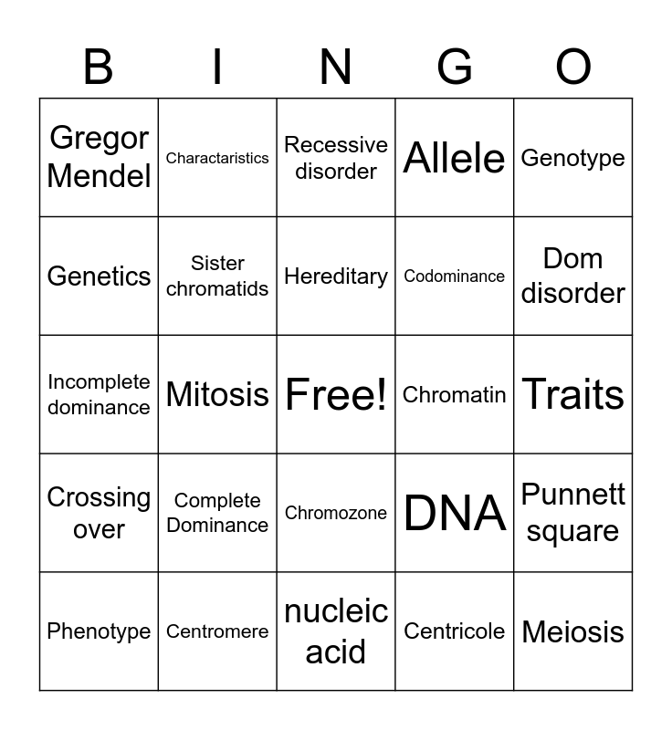 This bingo card has a free space and 24 words: Complete Dominance, Centromere, Hereditary, Phenotype, Genotype, Gregor Mendel, Genetics, Charactaristics, Chromatin, Chromozone, Codominance, Incomplete dominance, DNA, Punnett square, Sister chromatids, Centricole, Traits, Recessive disorder, Dom disorder, Mitosis, Meiosis, Crossing over, Allele and nucleic acid.
