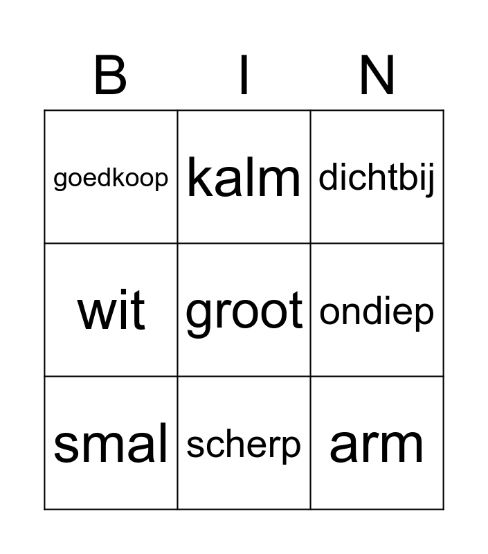 This bingo card has a free space and 8 words: ondiep, dichtbij, kalm, smal, goedkoop, arm, wit and scherp.
