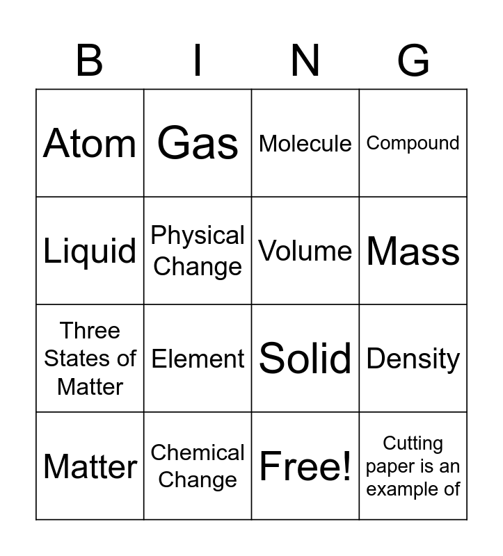 This bingo card has 17 words: Free!, Matter, Molecule, Atom, Element, Compound, Density, Volume, Mass, Physical Change, Chemical Change, Solid, Liquid, Gas, Three States of Matter, Burning Wood is an example of and Cutting paper is an example of.