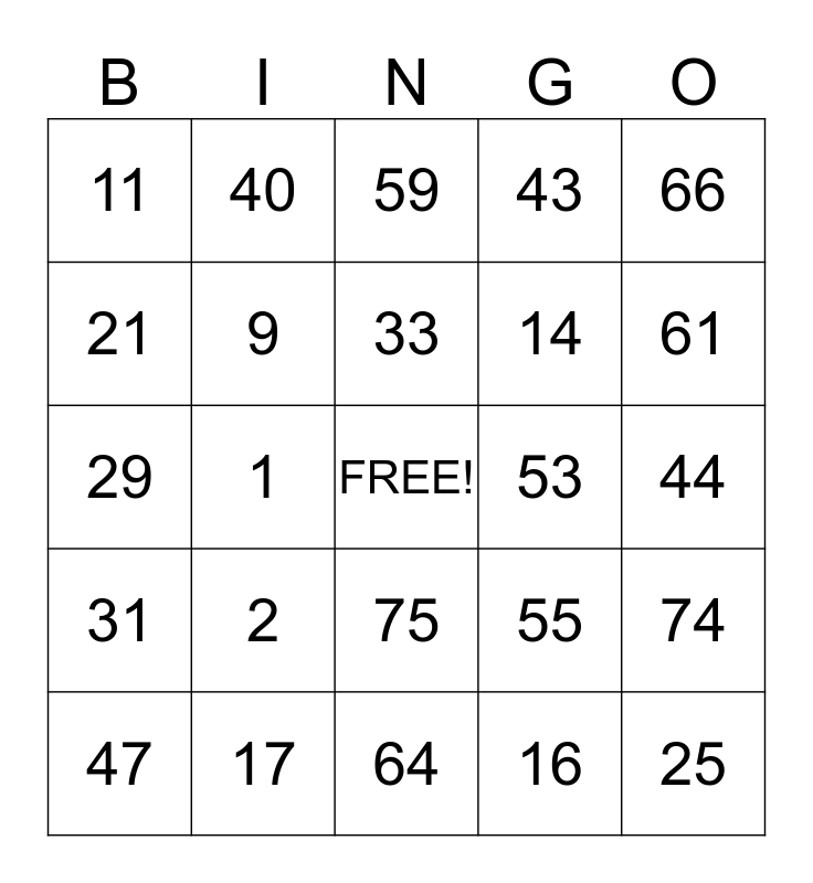This bingo card has a free space and 24 words: 2, 17, 33, 47, 66, 11, 21, 40, 53, 75, 14, 29, 55, 74, 9, 16, 44, 59, 61, 1, 25, 31, 43 and 64.