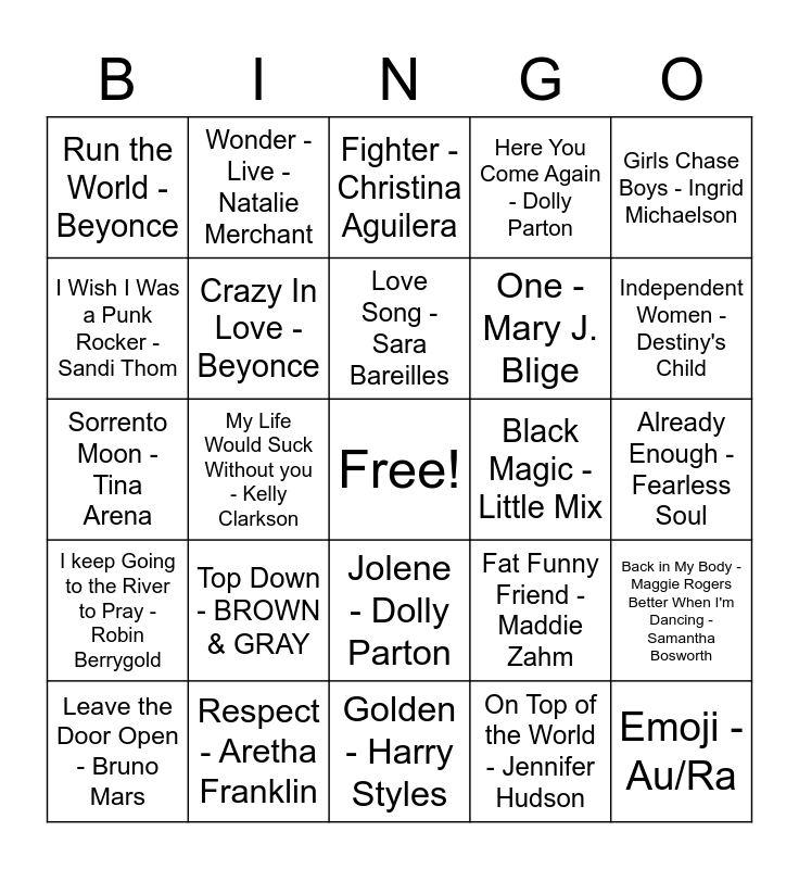 This bingo card has a free space and 25 words: Top Down - BROWN & GRAY, Golden - Harry Styles, Love Song - Sara Bareilles, Leave the Door Open - Bruno Mars, Girls Chase Boys - Ingrid Michaelson, Run the World - Beyonce, I Wish I Was a Punk Rocker - Sandi Thom, Wonder - Live - Natalie Merchant, Black Magic - Little Mix, Jolene - Dolly Parton, One - Mary J. Blige, Sorrento Moon - Tina Arena, Fat Funny Friend - Maddie Zahm, Back in My Body - Maggie Rogers Better When I'm Dancing - Samantha Bosworth, Crazy In Love - Beyonce, Try - Colbie Caillat, Already Enough - Fearless Soul, Fighter - Christina Aguilera, Independent Women - Destiny's Child, My Life Would Suck Without you - Kelly Clarkson, Emoji - Au/Ra, Respect - Aretha Franklin, I keep Going to the River to Pray - Robin Berrygold, Here You Come Again - Dolly Parton and On Top of the World - Jennifer Hudson.