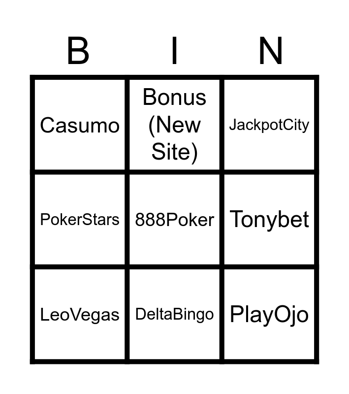 This bingo card has 11 words: PlayOjo, DeltaBingo, 888Poker, LeoVegas, Bonus (New Site), JackpotCity, Tonybet, Betway, PokerStars, Casumo and Slotomania.