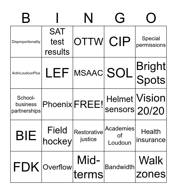 This bingo card has a free space and 43 words: Fully funded, Walk zones, December list, FDK, Oracle, Bandwidth, OTTW, PBL, Special permissions, Overflow, CIP, Helmet sensors, Restorative justice, Field hockey, BYOT, Mid-terms, Snow day, School-business partnerships, Senior Staff, Bright Spots, SAT test results, Transparency, Strategic, Disproportionality, Twitter, Vision 20/20, ALT, Energy Star, Academies of Loudoun, BIE, VRS, Health insurance, Stakeholder Work group, Phoenix, Lockdown, LEAP, SEAC, MSAAC, ActivLoudounPlus, SOL, Playgrounds, LEF and ELL.