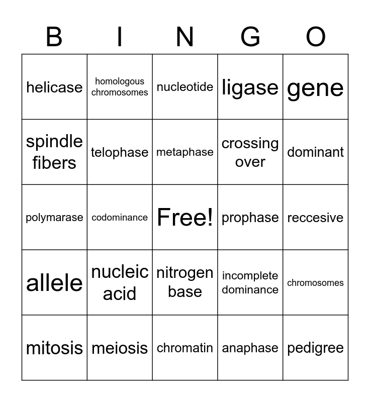 This bingo card has a free space and 24 words: nucleic acid, meiosis, metaphase, mitosis, gene, helicase, spindle fibers, homologous chromosomes, prophase, nitrogen base, crossing over, polymarase, incomplete dominance, chromosomes, telophase, anaphase, reccesive, nucleotide, dominant, codominance, pedigree, allele, ligase and chromatin.