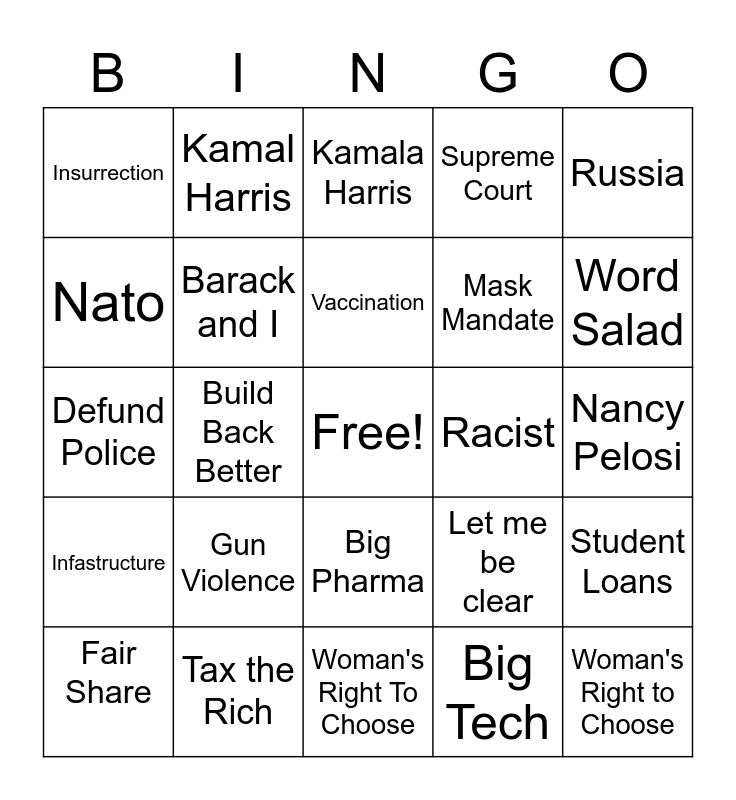 This bingo card has a free space and 36 words: Progress, American people, C'mon man, Barack and I, Let me be clear, Infastructure, Vaccination, China, Russia, Climate Change, Build Back Better, Supreme Court, Trump, Racist, Word Salad, Insurrection, Early Childhood Education, Gun Violence, Woman's Right to Choose, Kamala Harris, Nancy Pelosi, Student Loans, Tax the Rich, Fair Share, Woman's Right To Choose, Kamal Harris, Defund Police, Putin, Mask Mandate, Nato, United Nations, WW III, Big Tech, Big Pharma, Big Corporations and Middle Class.