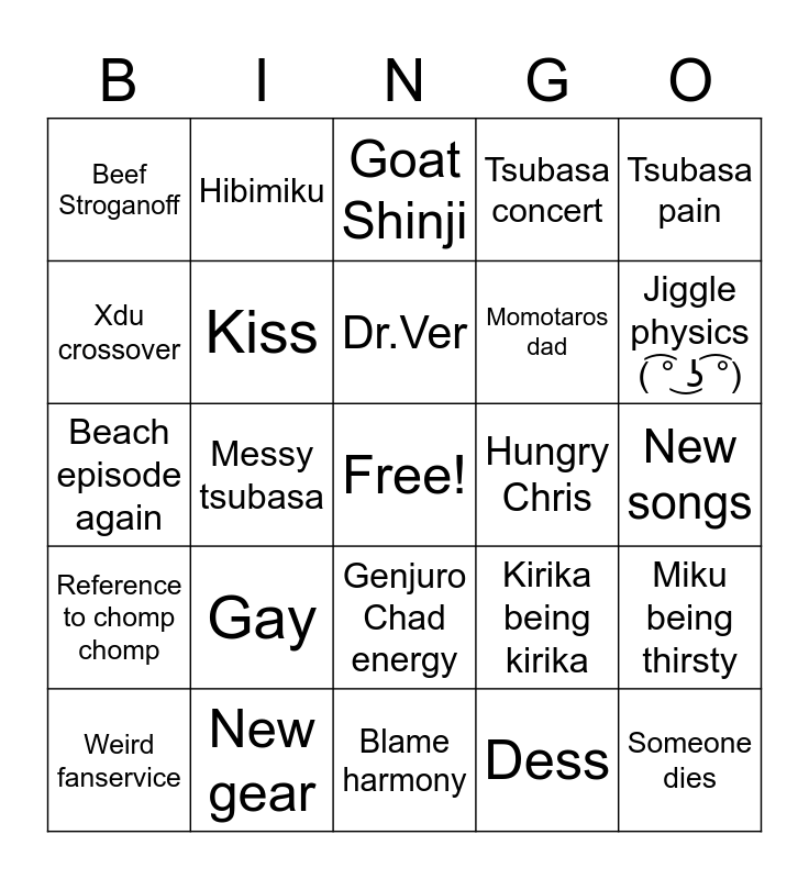 This bingo card has a free space and 24 words: Gay, New gear, Dr.Ver, Weird fanservice, Tsubasa pain, Beef Stroganoff, Xdu crossover, Hibimiku, Hungry Chris, Genjuro Chad energy, Momotaros dad, Beach episode again, Kirika being kirika, Miku being thirsty, Kiss, Dess, New songs, Goat Shinji, Jiggle physics ( ͡° ͜ʖ ͡°), Messy tsubasa, Someone dies, Reference to chomp chomp, Tsubasa concert and Blame harmony.