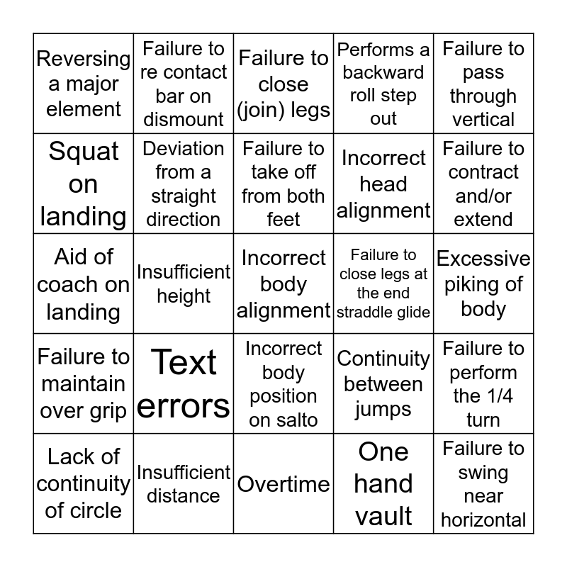 This bingo card has a free space and 24 words: Text errors, Insufficient distance, Failure to take off from both feet, Lack of continuity of circle, Failure to pass through vertical, Reversing a major element, Squat on landing, Failure to re contact bar on dismount, Failure to close legs at the end straddle glide, Incorrect body position on salto, Incorrect head alignment, Aid of coach on landing, Continuity between jumps, Failure to perform the 1/4 turn, Deviation from a straight direction, One hand vault, Excessive piking of body, Failure to close (join) legs, Failure to contract and/or extend, Insufficient height, Failure to swing near horizontal, Failure to maintain over grip, Performs a backward roll step out and Overtime.