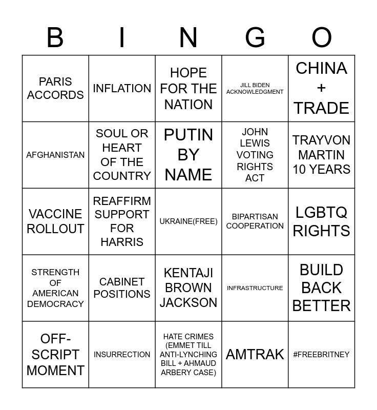This bingo card has a free space and 25 words: CABINET POSITIONS, HATE CRIMES (EMMET TILL ANTI-LYNCHING BILL + AHMAUD ARBERY CASE), PUTIN BY NAME, OFF-SCRIPT MOMENT, CHINA + TRADE, PARIS ACCORDS, AFGHANISTAN, INFLATION, BIPARTISAN COOPERATION, KENTAJI BROWN JACKSON, JOHN LEWIS VOTING RIGHTS ACT, VACCINE ROLLOUT, INFRASTRUCTURE, BUILD BACK BETTER, SOUL OR HEART OF THE COUNTRY, CENSORSHIP OF BOOKS/CURRICULUM, LGBTQ RIGHTS, HOPE FOR THE NATION, TRAYVON MARTIN 10 YEARS, REAFFIRM SUPPORT FOR HARRIS, #FREEBRITNEY, INSURRECTION, STRENGTH OF AMERICAN DEMOCRACY, JILL BIDEN ACKNOWLEDGMENT and AMTRAK.