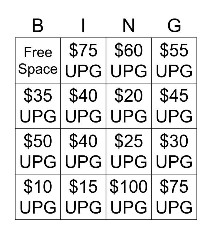 This bingo card has 16 words: $15 UPG, $30 UPG, $60 UPG, Free Space, $50 UPG, $75 UPG, $25 UPG, $100 UPG, $35 UPG, $40 UPG, $10 UPG, $55 UPG, $40 UPG, $45 UPG, $20 UPG and $75 UPG.