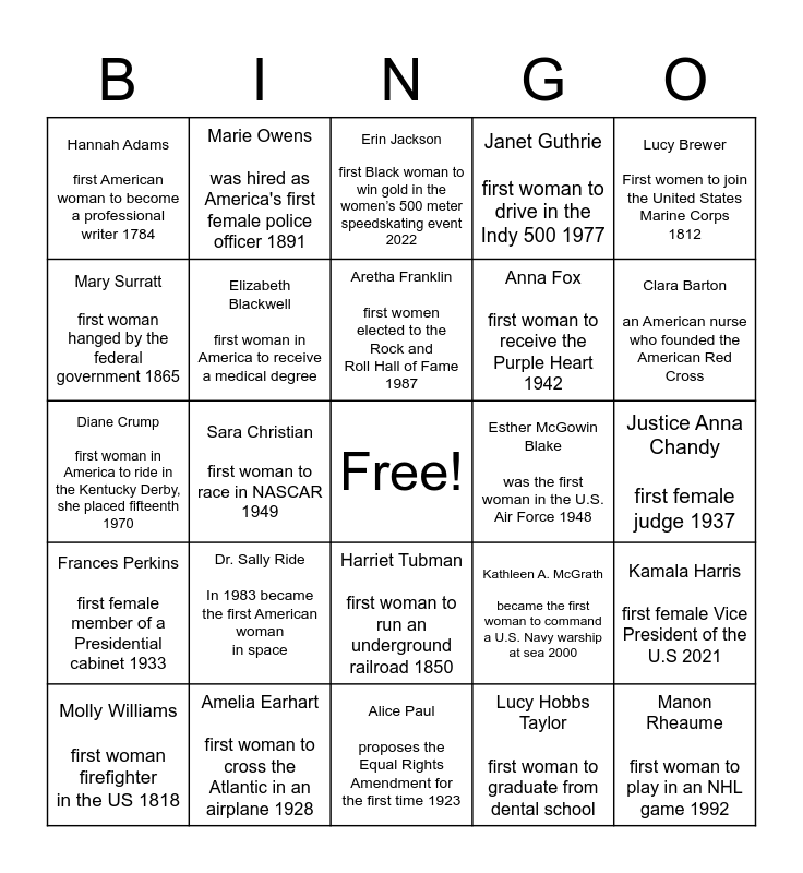 This bingo card has a free space and 24 words: Dr. Sally Ride In 1983 became the first American woman in space, Amelia Earhart first woman to cross the Atlantic in an airplane 1928, Aretha Franklin first women elected to the Rock and Roll Hall of Fame 1987, Molly Williams first woman firefighter in the US 1818, Lucy Brewer First women to join the United States Marine Corps 1812, Hannah Adams first American woman to become a professional writer 1784, Mary Surratt first woman hanged by the federal government 1865, Marie Owens was hired as America's first female police officer 1891, Esther McGowin Blake was the first woman in the U.S. Air Force 1948, Harriet Tubman first woman to run an underground railroad 1850, Anna Fox first woman to receive the Purple Heart 1942, Diane Crump first woman in America to ride in the Kentucky Derby, she placed fifteenth 1970, Kathleen A. McGrath became the first woman to command a U.S. Navy warship at sea 2000, Kamala Harris first female Vice President of the U.S 2021, Elizabeth Blackwell first woman in America to receive a medical degree, Lucy Hobbs Taylor first woman to graduate from dental school, Justice Anna Chandy first female judge 1937, Erin Jackson first Black woman to win gold in the women’s 500 meter speedskating event 2022, Clara Barton an American nurse who founded the American Red Cross, Sara Christian first woman to race in NASCAR 1949, Manon Rheaume first woman to play in an NHL game 1992, Frances Perkins first female member of a Presidential cabinet 1933, Janet Guthrie first woman to drive in the Indy 500 1977 and Alice Paul proposes the Equal Rights Amendment for the first time 1923.