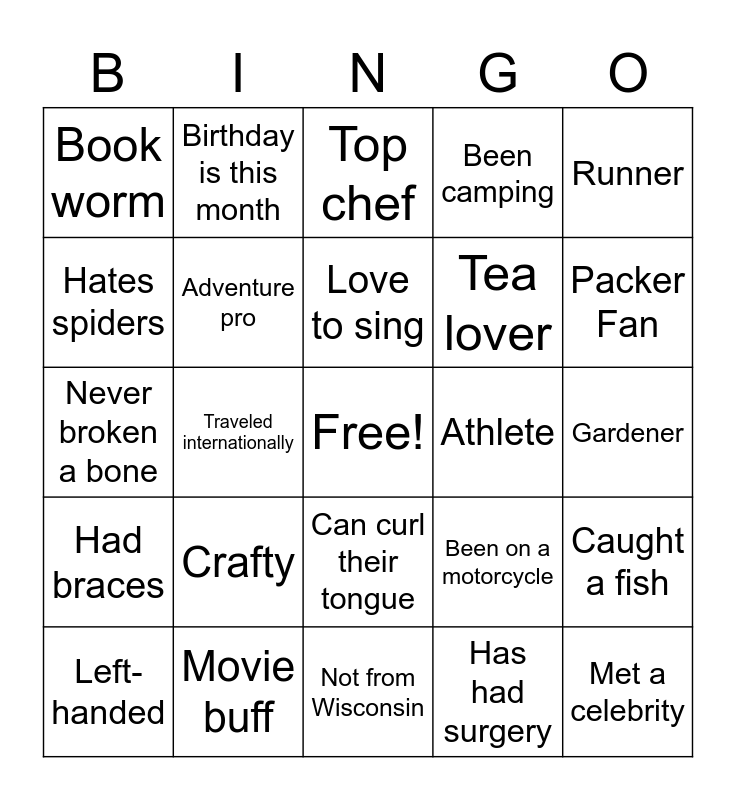 This bingo card has a free space and 29 words: Left-handed, Has a pet, Traveled internationally, Musician, Book worm, Top chef, Adventure pro, Crafty, Athlete, Movie buff, Gardener, Met a celebrity, Not from Wisconsin, Has had surgery, Packer Fan, Can speak another language, Can curl their tongue, Had braces, Runner, Never broken a bone, Been on a motorcycle, Coffee lover, Tea lover, Hates spiders, Been camping, Birthday is this month, Caught a fish, Love to sing and Dislikes chocolate.
