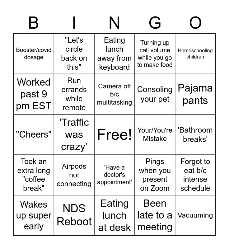 This bingo card has a free space and 34 words: Slept at work, Been late to a meeting, Family member walk by during zoom call, Say "sorry - i was on mute", Took an extra long "coffee break", Run errands while remote, Homeschooling children, Wakes up super early, "Let's circle back on this", Email sent out to wrong person, Camera off b/c multitasking, Eating lunch away from keyboard, Fixing your internet, Zoom Log-in/Log-out Issues, Your/You're Mistake, Pajama pants, NDS Reboot, "Cheers", Airpods not connecting, Pings when you present on Zoom, 'Have a doctor's appointment', Overslept, Booster/covid dosage, 'Bathroom breaks', Eating lunch at desk, Vacuuming, Turning up call volume while you go to make food, Calling your bank, Consoling your pet, Worked past 9 pm EST, Skipped a workout, 'Traffic was crazy', Forgot to eat b/c intense schedule and Hungover at work.