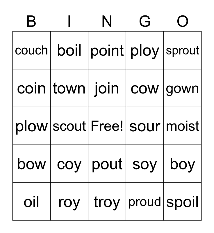 This bingo card has a free space and 24 words: coy, roy, join, oil, sprout, couch, coin, boil, sour, pout, cow, plow, soy, boy, town, proud, moist, point, gown, scout, spoil, bow, ploy and troy.