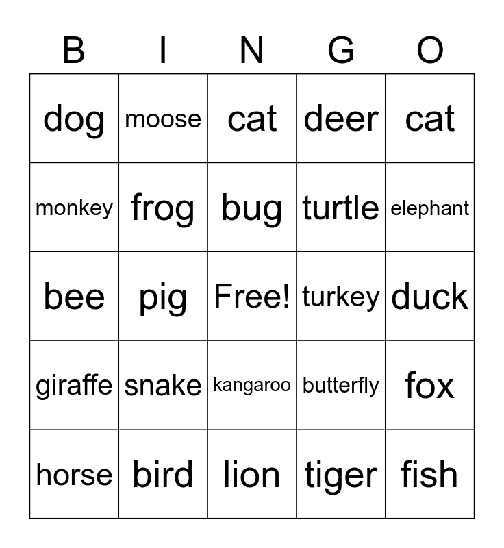 This bingo card has a free space and 29 words: horse, cow, pig, bull, dog, cat, frog, snake, turkey, bird, duck, fish, lion, tiger, elephant, bear, kangaroo, giraffe, cat, bee, butterfly, spider, turtle, monkey, deer, moose, fox, bug and mouse.