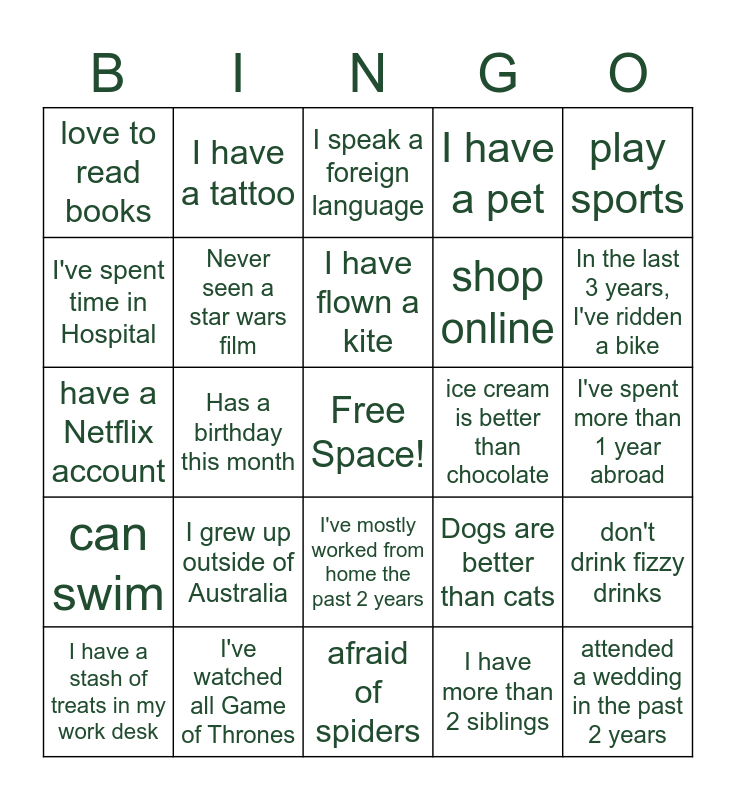 This bingo card has a free space and 24 words: I grew up outside of Australia, I've watched all Game of Thrones, I have flown a kite, I have a stash of treats in my work desk, play sports, love to read books, I've spent time in Hospital, I have a tattoo, ice cream is better than chocolate, I've mostly worked from home the past 2 years, shop online, have a Netflix account, Dogs are better than cats, don't drink fizzy drinks, Never seen a star wars film, I have more than 2 siblings, I've spent more than 1 year abroad, I speak a foreign language, In the last 3 years, I've ridden a bike, Has a birthday this month, attended a wedding in the past 2 years, can swim, I have a pet and afraid of spiders.