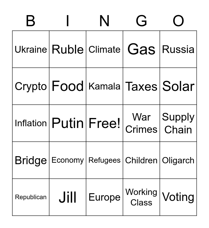 This bingo card has a free space and 24 words: Economy, Jill, Kamala, Republican, Russia, Ukraine, Crypto, Ruble, War Crimes, Refugees, Taxes, Inflation, Children, Oligarch, Food, Working Class, Supply Chain, Climate, Solar, Putin, Voting, Bridge, Gas and Europe.