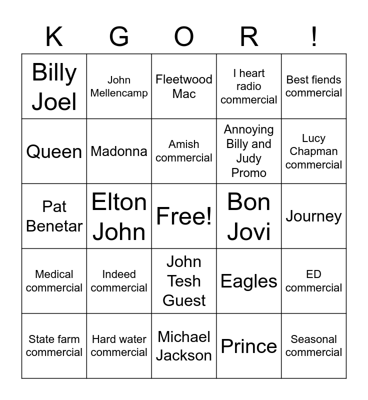 This bingo card has a free space and 24 words: Indeed commercial, Hard water commercial, Amish commercial, State farm commercial, Best fiends commercial, Billy Joel, Queen, John Mellencamp, Bon Jovi, John Tesh Guest, Annoying Billy and Judy Promo, Pat Benetar, Eagles, ED commercial, Madonna, Prince, Journey, Fleetwood Mac, Lucy Chapman commercial, Elton John, Seasonal commercial, Medical commercial, I heart radio commercial and Michael Jackson.
