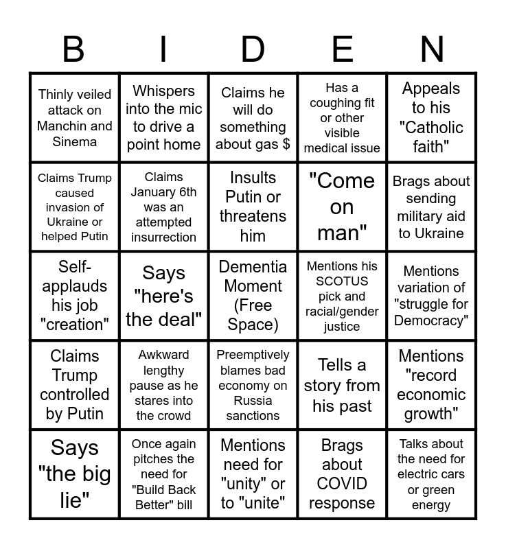 This bingo card has a free space and 24 words: Awkward lengthy pause as he stares into the crowd, Once again pitches the need for "Build Back Better" bill, Insults Putin or threatens him, Says "the big lie", Appeals to his "Catholic faith", Thinly veiled attack on Manchin and Sinema, Claims Trump caused invasion of Ukraine or helped Putin, Whispers into the mic to drive a point home, Mentions his SCOTUS pick and racial/gender justice, Preemptively blames bad economy on Russia sanctions, "Come on man", Self-applauds his job "creation", Tells a story from his past, Mentions "record economic growth", Claims January 6th was an attempted insurrection, Brags about COVID response, Mentions variation of "struggle for Democracy", Claims he will do something about gas $, Brags about sending military aid to Ukraine, Says "here's the deal", Talks about the need for electric cars or green energy, Claims Trump controlled by Putin, Has a coughing fit or other visible medical issue and Mentions need for "unity" or to "unite".