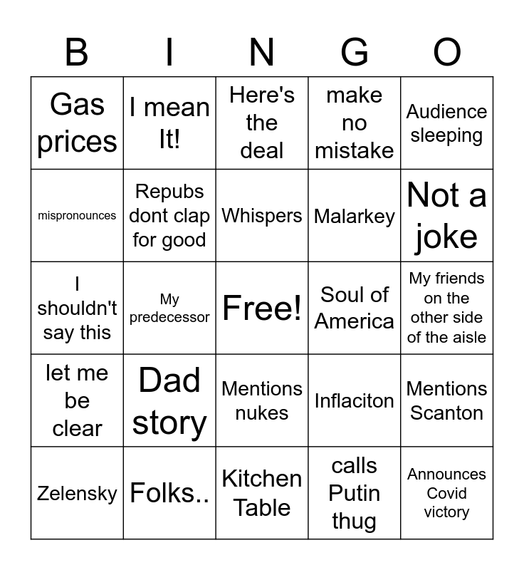 This bingo card has a free space and 24 words: Dad story, Folks.., Whispers, Zelensky, Audience sleeping, Gas prices, mispronounces, I mean It!, Soul of America, Mentions nukes, Malarkey, I shouldn't say this, Inflaciton, Mentions Scanton, Repubs dont clap for good, calls Putin thug, My friends on the other side of the aisle, Here's the deal, Not a joke, My predecessor, Announces Covid victory, let me be clear, make no mistake and Kitchen Table.