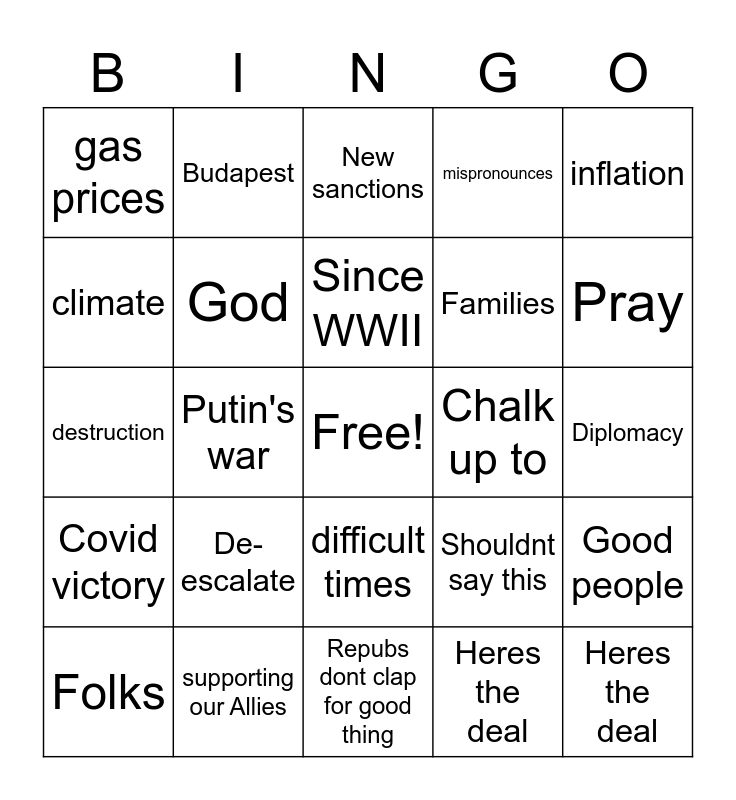 This bingo card has a free space and 24 words: De-escalate, supporting our Allies, Since WWII, Folks, inflation, gas prices, climate, Budapest, Chalk up to, difficult times, Families, destruction, Shouldnt say this, Good people, God, Heres the deal, Diplomacy, New sanctions, Pray, Putin's war, Heres the deal, Covid victory, mispronounces and Repubs dont clap for good thing.