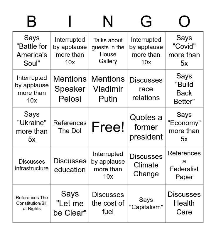 This bingo card has a free space and 29 words: Interrupted by applause more than 10x, Says "Let me be Clear", Talks about guests in the House Gallery, SCOTUS Justice applauds, Says "Covid" more than 5x, Says "Battle for America's Soul", Mentions Speaker Pelosi, Mentions Vladimir Putin, Quotes a former president, References a Federalist Paper, References The Constitution/Bill of Rights, References The DoI, Says "Capitalism", Discusses Health Care, Says "Ukraine" more than 5x, Says "China", Discusses the cost of fuel, Discusses Climate Change, Says "Build Back Better", Discusses infrastructure, Discusses education, Discusses immigration reform, Discusses race relations, Says "Economy" more than 5x, Interrupted by applause more than 10x, Interrupted by applause more than 10x, Interrupted by applause more than 10x, Interrupted by applause more than 10x and Interrupted by applause more than 10x.