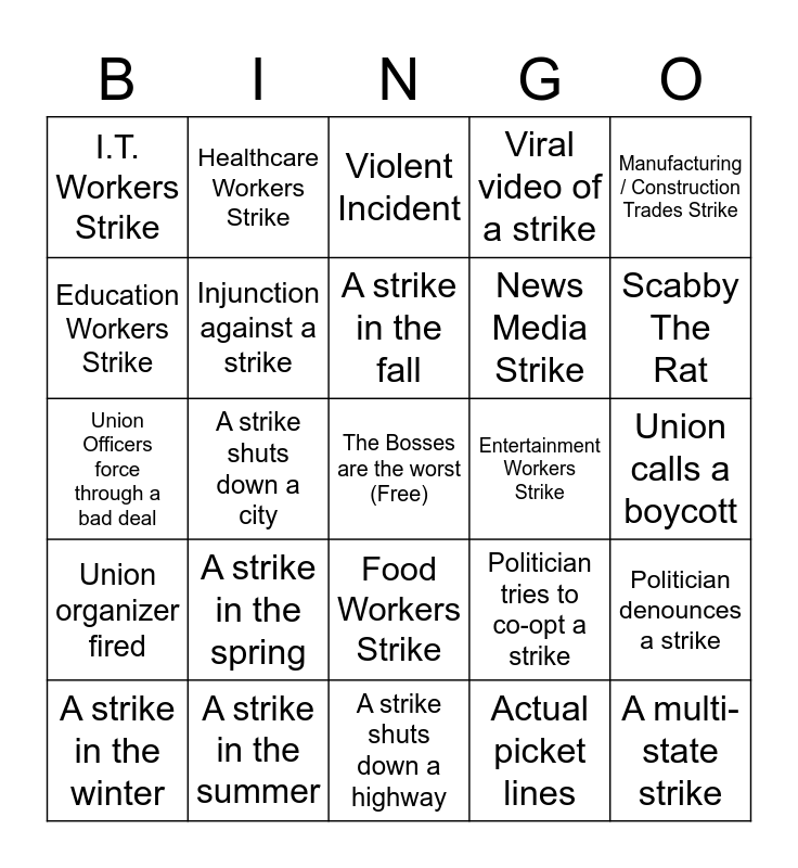 This bingo card has a free space and 24 words: A strike in the spring, A strike in the summer, A strike in the fall, A strike in the winter, Manufacturing / Construction Trades Strike, I.T. Workers Strike, Education Workers Strike, Healthcare Workers Strike, Entertainment Workers Strike, Food Workers Strike, News Media Strike, Union Officers force through a bad deal, Politician tries to co-opt a strike, Politician denounces a strike, Injunction against a strike, Actual picket lines, Union calls a boycott, Violent Incident, Scabby The Rat, A strike shuts down a city, A multi-state strike, Union organizer fired, Viral video of a strike and A strike shuts down a highway.