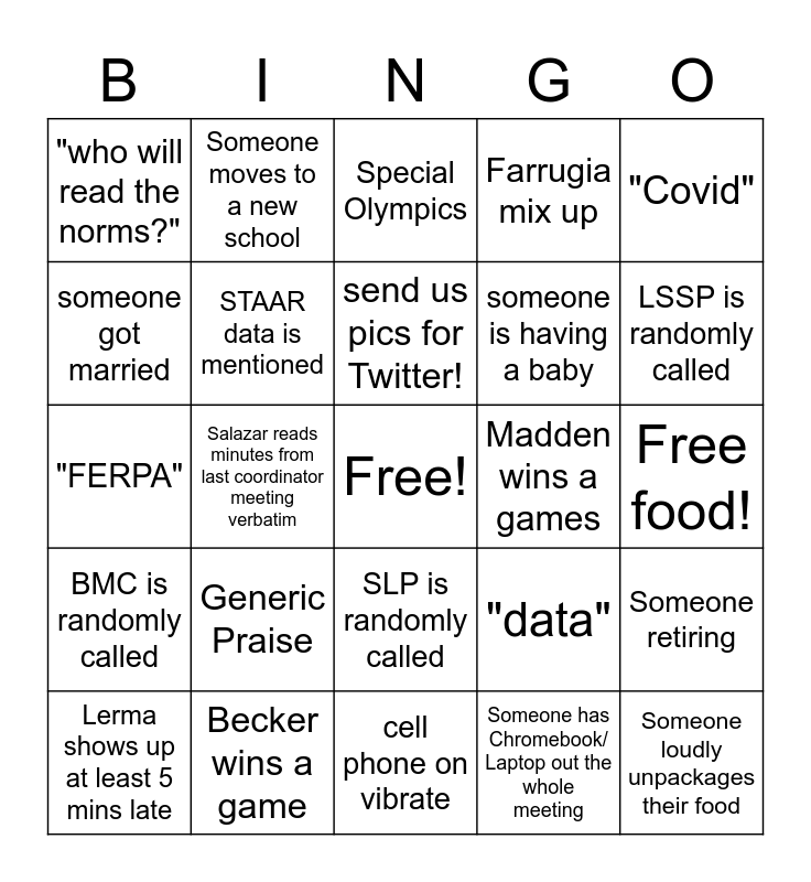 This bingo card has a free space and 29 words: Lerma shows up at least 5 mins late, "Juan John", Salazar reads minutes from last coordinator meeting verbatim, Coaches are called on to report about their team, "who will read the norms?", Special Olympics, STAAR data is mentioned, Generic Praise, Madden wins a games, Becker wins a game, Free food!, Someone loudly unpackages their food, cell phone on vibrate, Someone has Chromebook/ Laptop out the whole meeting, LSSP is randomly called, Cell phone rings, SLP is randomly called, BMC is randomly called, "Covid", "FERPA", "data", coaches high five, someone is having a baby, someone got married, Farrugia mix up, Someone moves to a new school, Someone retiring, send us pics for Twitter! and 20 seconds of silence.