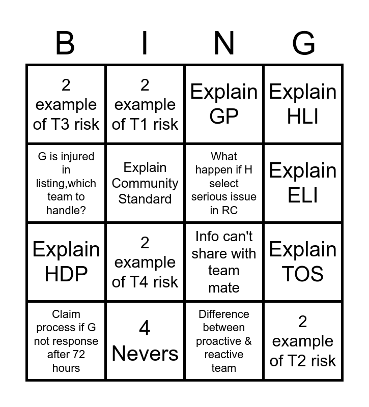 This bingo card has 16 words: 4 Nevers, Explain TOS, Explain GP, 2 example of T3 risk, Explain HDP, 2 example of T1 risk, Info can't share with team mate, Difference between proactive & reactive team, G is injured in listing,which team to handle?, Explain Community Standard, Claim process if G not response after 72 hours, Explain HLI, 2 example of T4 risk, Explain ELI, What happen if H select serious issue in RC and 2 example of T2 risk.