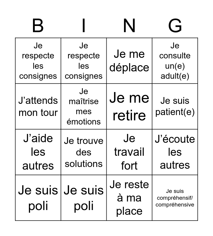 ⚠ This card has duplicate items: Je suis poli (2), Je partage (2), J’attends mon tour (2), J’écoute les autres (2), Je me calme (2), Je respecte les consignes (2), J’aide les autres (2), Je maîtrise mes émotions (2), Je trouve des solutions (2), Je me retire (2), Je me connais (2), Je suis compréhensif/ compréhensive (2), Je pardonne (2), Je m’excuse (2), Je suis patient(e) (2)