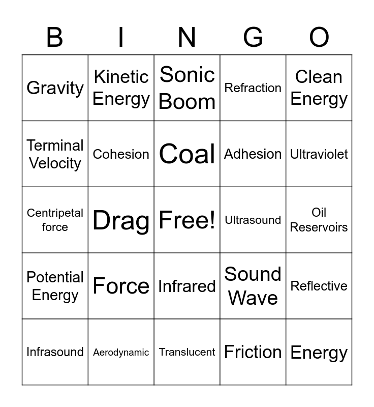 This bingo card has a free space and 24 words: Force, Aerodynamic, Coal, Infrasound, Clean Energy, Gravity, Terminal Velocity, Kinetic Energy, Ultrasound, Infrared, Adhesion, Centripetal force, Sound Wave, Reflective, Cohesion, Friction, Oil Reservoirs, Sonic Boom, Ultraviolet, Drag, Energy, Potential Energy, Refraction and Translucent.