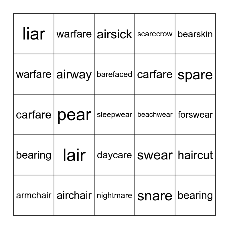 This bingo card has 25 words: lair, nightmare, barefaced, armchair, bearskin, liar, warfare, warfare, beachwear, daycare, carfare, carfare, swear, haircut, airway, bearing, forswear, airsick, spare, pear, sleepwear, airchair, bearing, scarecrow and snare.