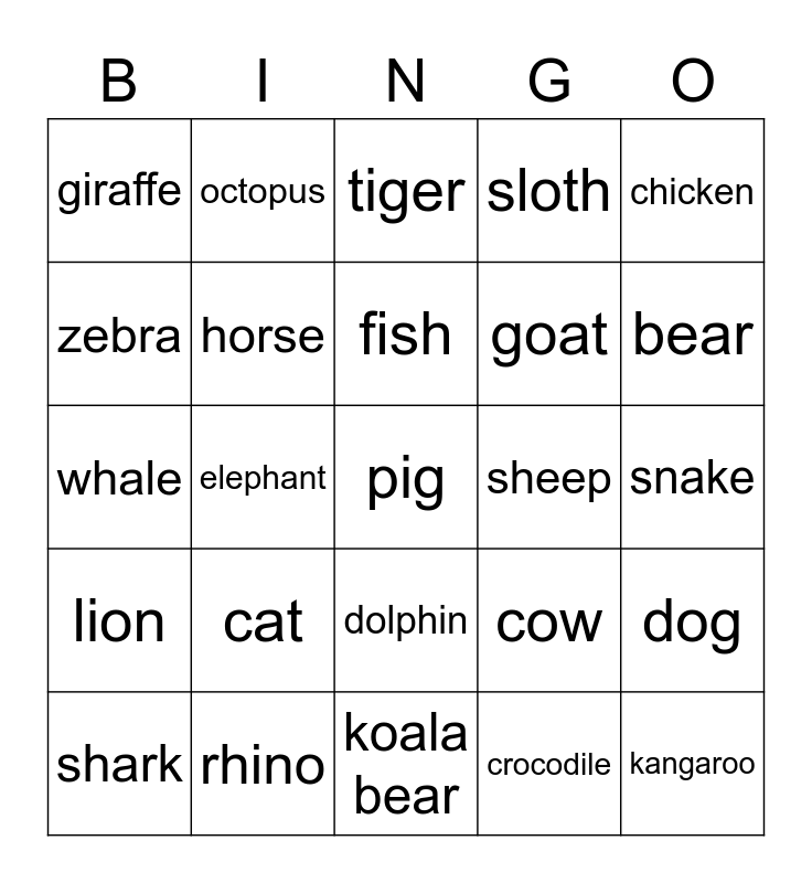 This bingo card has a free space and 24 words: cat, rhino, fish, shark, chicken, giraffe, zebra, octopus, sheep, dolphin, goat, whale, cow, dog, horse, crocodile, snake, tiger, bear, elephant, kangaroo, lion, sloth and koala bear.