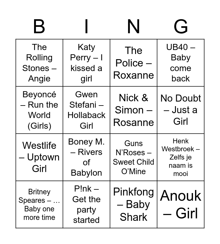 This bingo card has 31 words: Free!, Hans de Booij – Annabel, Henk Westbroek – Zelfs je naam is mooi, Jacques Herb – Manuela, The Rolling Stones – Angie, The Police – Roxanne, Nick & Simon – Rosanne, Amy Winehouse – Valerie, P!nk – Get the party started, P!nk – Raise your glass, Pinkfong – Baby Shark, Britney Speares – …Baby one more time, Van Velzen – Baby get higher, Justin Bieber – Baby, Boney M. – Rivers of Babylon, Muse – Plug in Baby, DJ Ötzi – Hey Baby, Alicia Keys – Girl is on Fire, Anouk – Girl, Cyndi Lauper – Girls just wanna have fun, Beyoncé – Run the World (Girls), Van Morrison – Brown Eyed Girl, Spice Girls – Wannabe, Katy Perry – I kissed a girl, Westlife – Uptown Girl, Gwen Stefani – Hollaback Girl, UB40 – Baby come back, Guns N’Roses – Sweet Child O’Mine, Nakatomi – Children of the night, No Doubt – Just a Girl and Arne Jansen – Meisjes met rode haren.