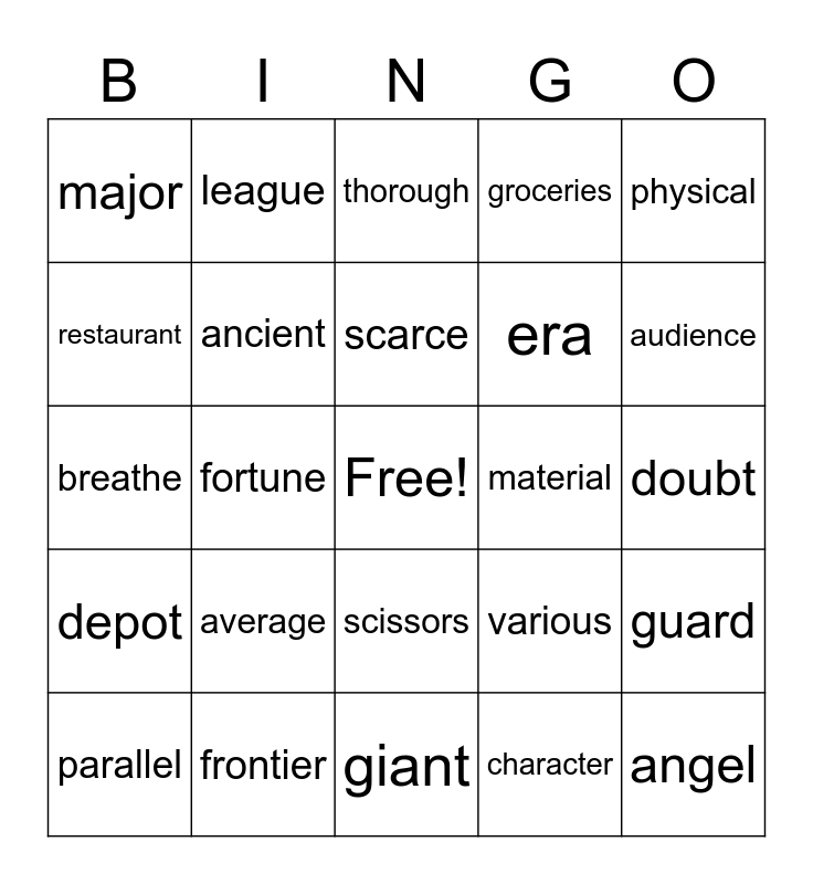 This bingo card has a free space and 24 words: average, frontier, scarce, parallel, physical, major, restaurant, league, material, scissors, era, breathe, various, guard, ancient, character, doubt, thorough, audience, fortune, angel, depot, groceries and giant.