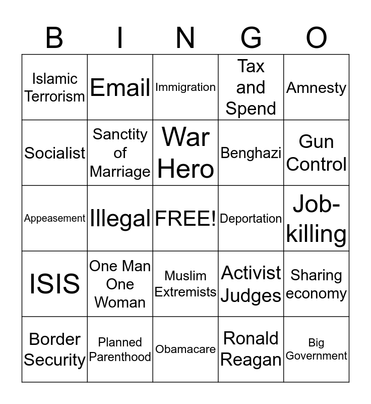 This bingo card has a free space and 29 words: Border Security, Allien, Illegal, Sanctuary City, Islamic Terrorism, Immigration, Sanctity of Marriage, One Man One Woman, Deportation, Planned Parenthood, Job-killing, Big Government, Obamacare, Ronald Reagan, Gun Control, Liberals, Muslim Extremists, ISIS, Amnesty, Appeasement, Activist Judges, Religious Freedom, Benghazi, Socialist, Tax and Spend, Email, Sharing economy, War Hero and AllLivesMatter.