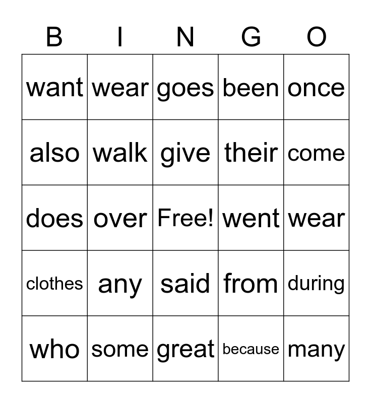 This bingo card has a free space and 24 words: any, some, give, who, once, want, also, wear, went, said, their, does, from, during, walk, because, wear, goes, come, over, many, clothes, been and great.