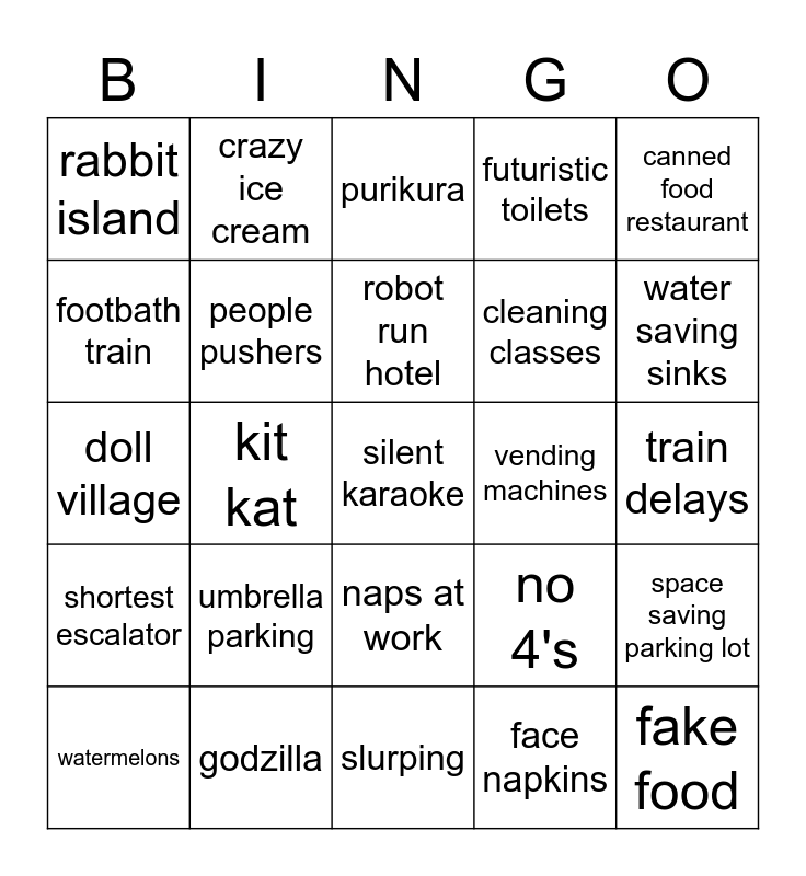 This bingo card has 29 words: watermelons, ramen soup bath, kit kat, fake food, rabbit island, purikura, people pushers, umbrella parking, vending machines, godzilla, train delays, silent karaoke, slurping, face napkins, water saving sinks, strange mayo, naps at work, shortest escalator, canned food restaurant, doll village, no 4's, blue traffic lights, cleaning classes, footbath train, futuristic toilets, crazy ice cream, space saving parking lot, robot run hotel and cafe companion.