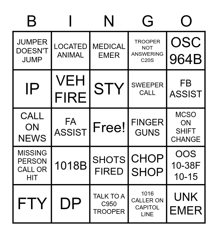 This bingo card has a free space and 24 words: 1018B, DP, STY, FTY, OSC 964B, JUMPER DOESN'T JUMP, IP, LOCATED ANIMAL, FINGER GUNS, SHOTS FIRED, SWEEPER CALL, CALL ON NEWS, CHOP SHOP, OOS 10-38F 10-15, VEH FIRE, 1016 CALLER ON CAPITOL LINE, MCSO ON SHIFT CHANGE, MEDICAL EMER, FB ASSIST, FA ASSIST, UNK EMER, MISSING PERSON CALL OR HIT, TROOPER NOT ANSWERING C20S and TALK TO A C950 TROOPER.