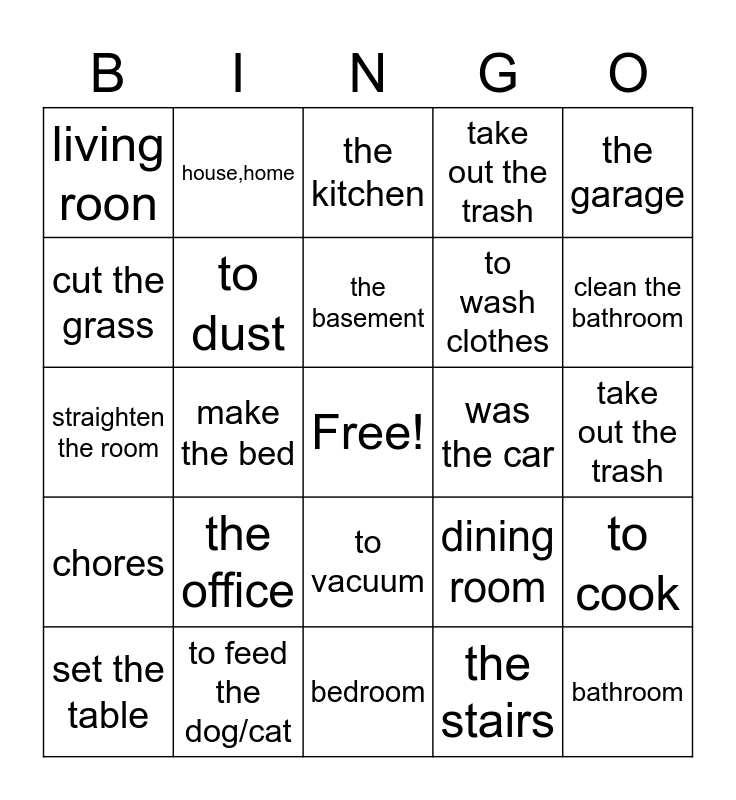 This bingo card has a free space and 24 words: the office, to feed the dog/cat, the basement, set the table, the garage, living roon, cut the grass, house,home, was the car, to vacuum, to wash clothes, straighten the room, dining room, to cook, to dust, the stairs, take out the trash, the kitchen, clean the bathroom, make the bed, bathroom, chores, take out the trash and bedroom.