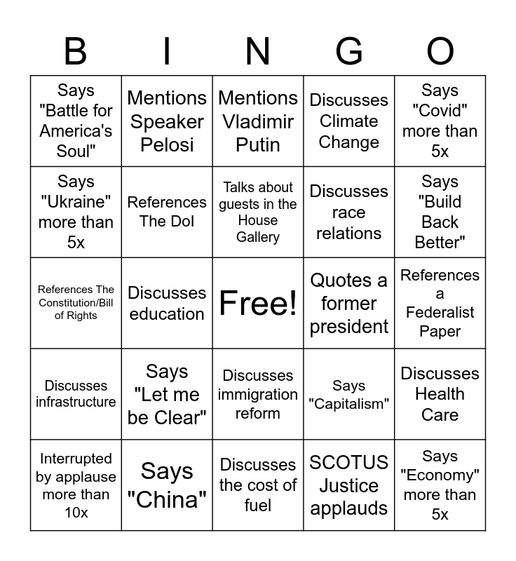 This bingo card has a free space and 24 words: Interrupted by applause more than 10x, Says "Let me be Clear", Talks about guests in the House Gallery, SCOTUS Justice applauds, Says "Covid" more than 5x, Says "Battle for America's Soul", Mentions Speaker Pelosi, Mentions Vladimir Putin, Quotes a former president, References a Federalist Paper, References The Constitution/Bill of Rights, References The DoI, Says "Capitalism", Discusses Health Care, Says "Ukraine" more than 5x, Says "China", Discusses the cost of fuel, Discusses Climate Change, Says "Build Back Better", Discusses infrastructure, Discusses education, Discusses immigration reform, Discusses race relations and Says "Economy" more than 5x.