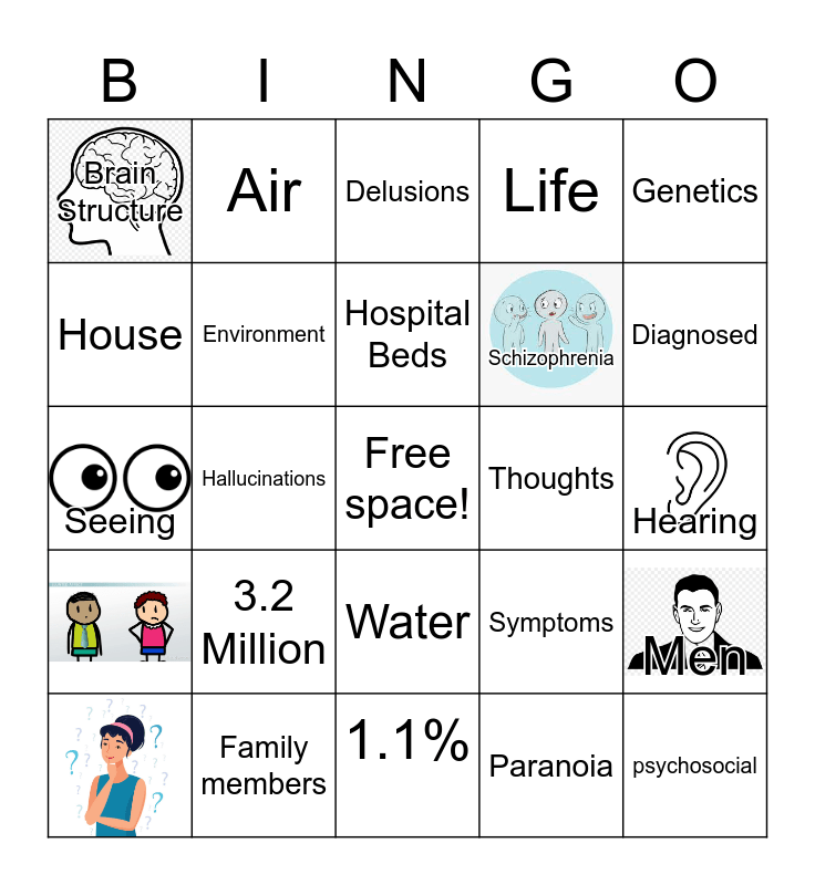 This bingo card has 8 images, a free space and 26 words: Therapy, Family members, Delusions, 1 Specific Cause, Genetics, Brain Structure, Environment, Hospital Beds, Thoughts, Men, Hallucinations, Paranoia, psychosocial, Seeing, 1.1%, Symptoms, Diagnosed, 3.2 Million, Anti-psychotic medications, Schizophrenia, Hearing, House, Air, Water, Life and Ears.