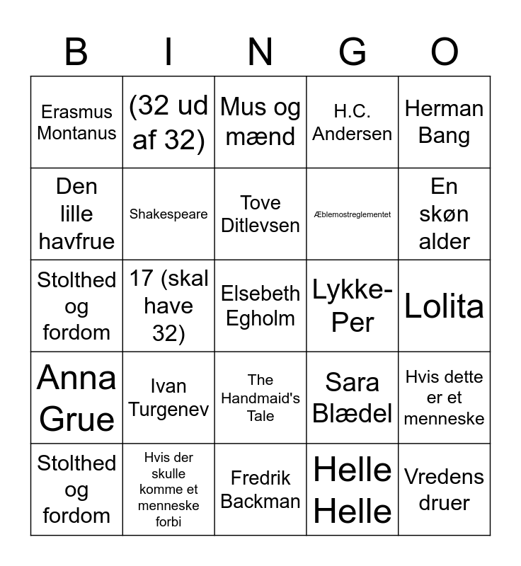 This bingo card has 35 words: Harry Potter, Hvem ringer klokkerne for, Madame Bovary, Shakespeare, The Handmaid's Tale, H.C. Andersen, Den lille havfrue, Karen Blixen, Tove Ditlevsen, Frankenstein, Stolthed og fordom, Herman Bang, Jussi Adler-Olsen, Ringenes Herre, Erasmus Montanus, Lykke-Per, Helle Helle, 17 (skal have 32), Anna Grue, Elsebeth Egholm, Sara Blædel, Stolthed og fordom, Hvis dette er et menneske, Hvis der skulle komme et menneske forbi, Mus og mænd, En skøn alder, Vredens druer, Normale mennesker, Æblemostreglementet, Lolita, Stille flyder Don, Fredrik Backman, Ivan Turgenev, (32 ud af 32) and Gud taler ud.