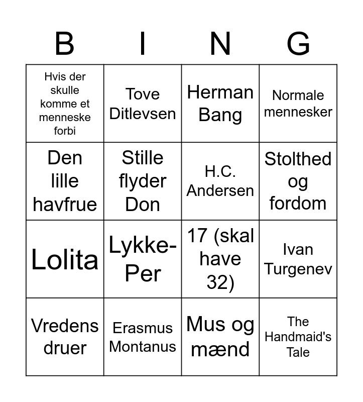 This bingo card has 34 words: Harry Potter, Hvem ringer klokkerne for, Madame Bovary, Shakespeare, The Handmaid's Tale, H.C. Andersen, Den lille havfrue, Karen Blixen, Tove Ditlevsen, Frankenstein, Stolthed og fordom, Herman Bang, Jussi Adler-Olsen, Ringenes Herre, Erasmus Montanus, Lykke-Per, Helle Helle, 17 (skal have 32), Anna Grue, Elsebeth Egholm, Sara Blædel, Hvis dette er et menneske, Hvis der skulle komme et menneske forbi, Mus og mænd, En skøn alder, Vredens druer, Normale mennesker, Æblemostreglementet, Lolita, Stille flyder Don, Fredrik Backman, Ivan Turgenev, (32 ud af 32) and Gud taler ud.