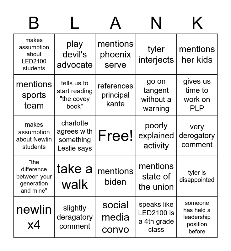 This bingo card has a free space and 24 words: take a walk, slightly deragatory comment, references principal kante, newlin x4, mentions her kids, makes assumption about LED2100 students, mentions sports team, play devil's advocate, poorly explained activity, mentions biden, go on tangent without a warning, makes assumption about Newlin students, mentions state of the union, tyler is disappointed, tells us to start reading "the covey book", speaks like LED2100 is a 4th grade class, very derogatory comment, mentions phoenix serve, gives us time to work on PLP, charlotte agrees with something Leslie says, someone has held a leadership position before, "the difference between your generation and mine", tyler interjects and social media convo.