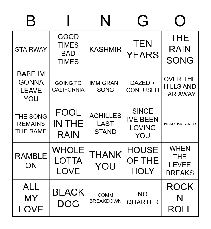 This bingo card has 25 words: WHOLE LOTTA LOVE, COMM BREAKDOWN, IMMIGRANT SONG, ALL MY LOVE, THE RAIN SONG, STAIRWAY, BABE IM GONNA LEAVE YOU, GOOD TIMES BAD TIMES, SINCE IVE BEEN LOVING YOU, THANK YOU, DAZED + CONFUSED, THE SONG REMAINS THE SAME, HOUSE OF THE HOLY, WHEN THE LEVEE BREAKS, GOING TO CALIFORNIA, ROCK N ROLL, HEARTBREAKER, KASHMIR, OVER THE HILLS AND FAR AWAY, FOOL IN THE RAIN, ACHILLES LAST STAND, BLACK DOG, RAMBLE ON, TEN YEARS and NO QUARTER.