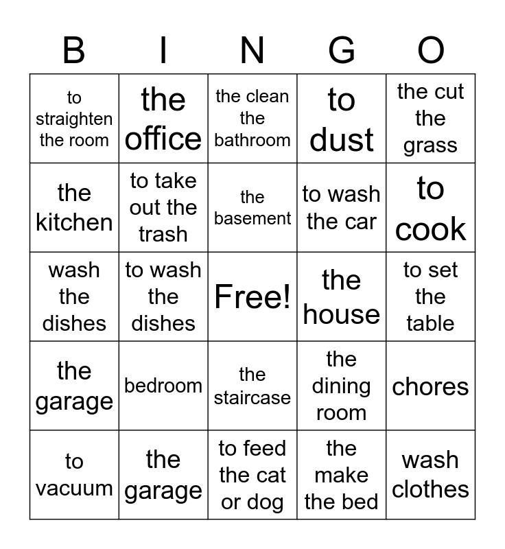 This bingo card has a free space and 24 words: bedroom, the garage, the basement, to vacuum, the cut the grass, to straighten the room, the kitchen, the office, the house, the staircase, to wash the car, wash the dishes, the dining room, chores, to take out the trash, the make the bed, to set the table, the clean the bathroom, to cook, to wash the dishes, wash clothes, the garage, to dust and to feed the cat or dog.