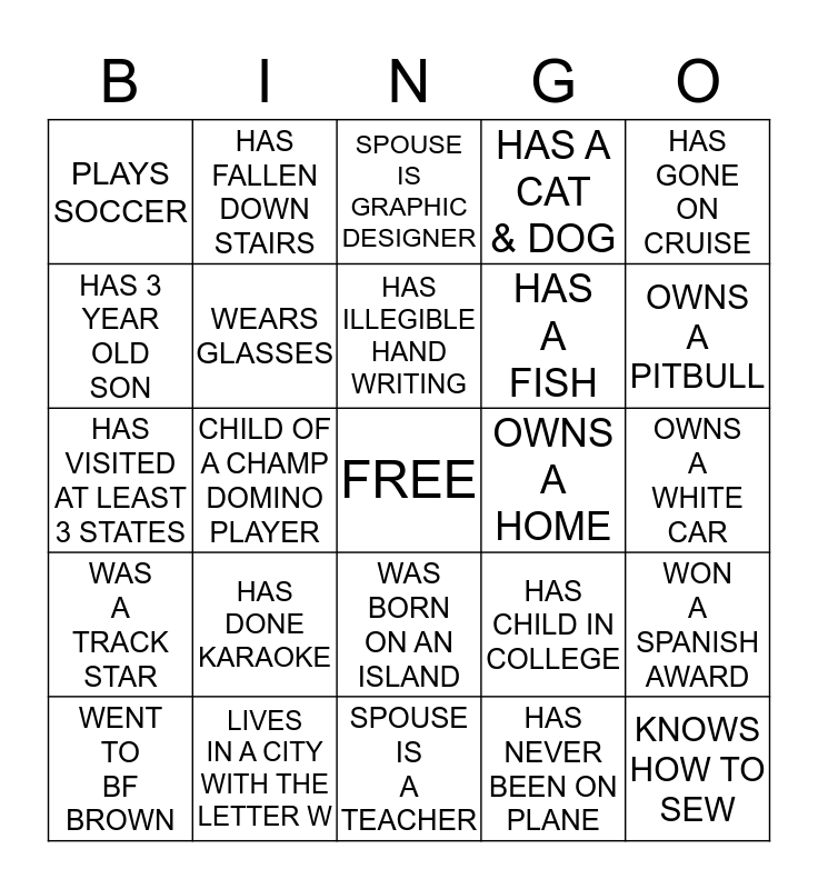 This bingo card has a free space and 24 words: HAS DONE KARAOKE, LIVES IN A CITY WITH THE LETTER W, HAS ILLEGIBLE HAND WRITING, WENT TO BF BROWN, HAS GONE ON CRUISE, PLAYS SOCCER, HAS 3 YEAR OLD SON, HAS FALLEN DOWN STAIRS, OWNS A HOME, WAS BORN ON AN ISLAND, HAS A FISH, HAS VISITED AT LEAST 3 STATES, HAS CHILD IN COLLEGE, WON A SPANISH AWARD, WEARS GLASSES, HAS NEVER BEEN ON PLANE, OWNS A WHITE CAR, SPOUSE IS GRAPHIC DESIGNER, OWNS A PITBULL, CHILD OF A CHAMP DOMINO PLAYER, KNOWS HOW TO SEW, WAS A TRACK STAR, HAS A CAT & DOG and SPOUSE IS A TEACHER.