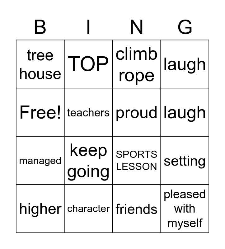 This bingo card has 16 words: character, setting, climb rope, tree house, managed, TOP, SPORTS LESSON, friends, Free!, teachers, higher, laugh, keep going, laugh, proud and pleased with myself.