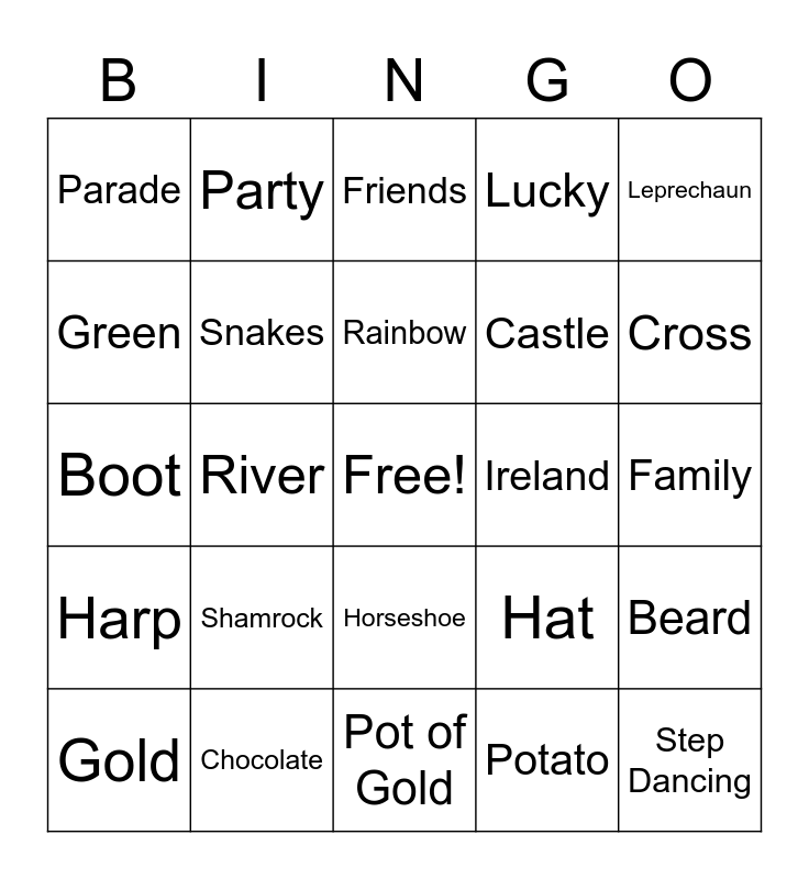 This bingo card has a free space and 24 words: Shamrock, Chocolate, Rainbow, Gold, Leprechaun, Parade, Green, Party, Ireland, Horseshoe, Castle, Boot, Hat, Beard, Snakes, Potato, Family, Friends, Cross, River, Step Dancing, Harp, Lucky and Pot of Gold.
